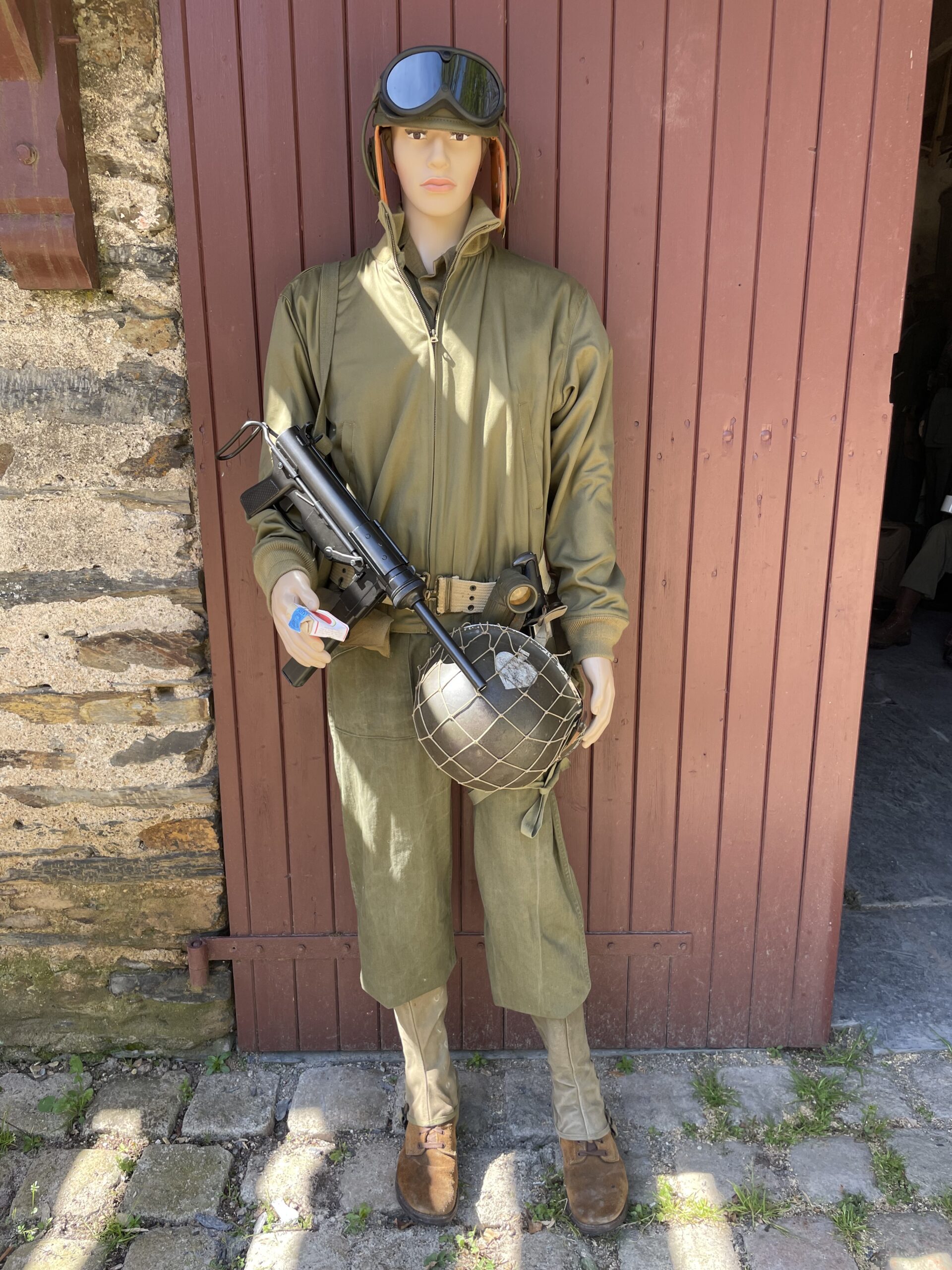 Il porte également une chemise kaki US. Son casque de protection est particulier : il est en cuir, avec ses lunettes de protection, mais peut être recouvert d’un casque lourd métallique USM1 si besoin.