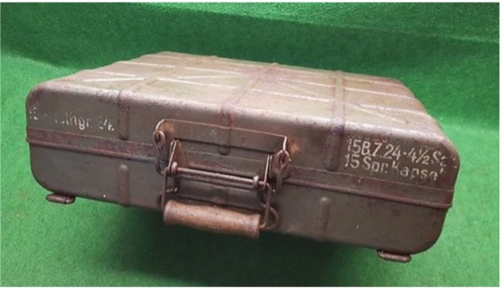 Elle dormait dans un fond de garage du Calvados : cette caisse métallique servait à transporter les grenades à manche. Ici avait stationné, près de la maison de ma grand-mère maternelle, une unité antiaérienne de la Luftwaffe. Après-guerre, la caisse a été réutilisée pour y mettre des outils. Oubliée dans un fond de grange, elle en est ressortie parce qu’une tante qui faisait du rangement s’est dit qu’elle pourrait m’intéresser, sans trop savoir ce que c’était.