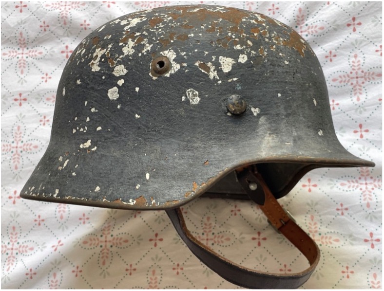 Lors de l’exposition UNC 1944, Youenn, un musicien de Trentemoult (Loire-Atlantique), m’a expliqué qu’il avait chez lui un casque allemand, trouvé dans un blockhaus de Pornic par son père, avec un canon de mitrailleuse, en fin de guerre, avec lequel, gamin, il jouait. Le casque était resté dans la garage. J’ai pu le récupèrer et en effectuant un nettoyage léger pour ne pas l’abimer, j’ai découvert au crayon à papier le grade et le nom du propriétaire allemand, l’Obergefreiter Seeger, et un autre nom dans le fond du casque : Karwahr, sans savoir ce que sont devenus ces soldats.