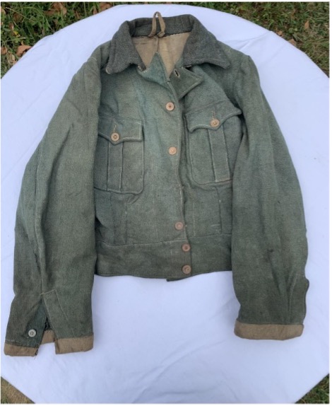 Ce blouson assez usagé (trous dans les coudes, boutons changés, épaulettes enlevées) a été trouvé par un Alsacien, Gabriel. Il m’explique que le blouson a été trouvé dans une malle avec du linge, et que la famille ignorait sa présence dans le grenier ou la grange. Le blouson vient d’un « Malgré-nous », prisonnier au camp de Tambov jusque dans les années 1946-47, et jamais sorti en collection. Gabriel me promet un nom et une photo. Et fini par les trouver : Le blouson vient d’un « Malgré-nous », Albert Eichenlaub